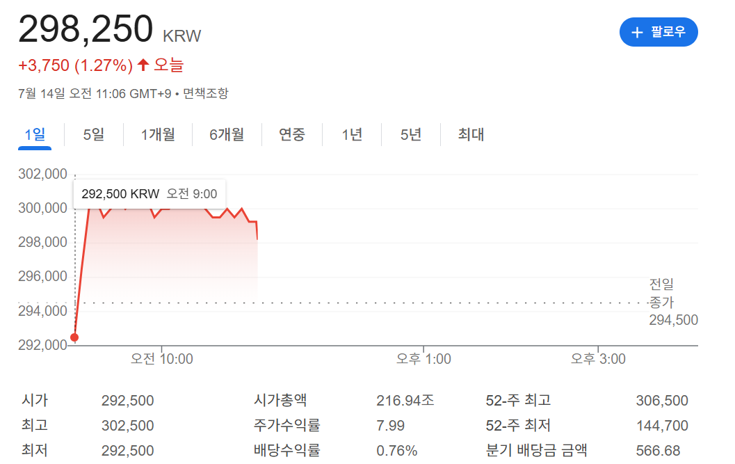 | 현재 주가 (2025년 7월 1일) | 279,000원 (USD 209.07) | MSN Money 기준 |