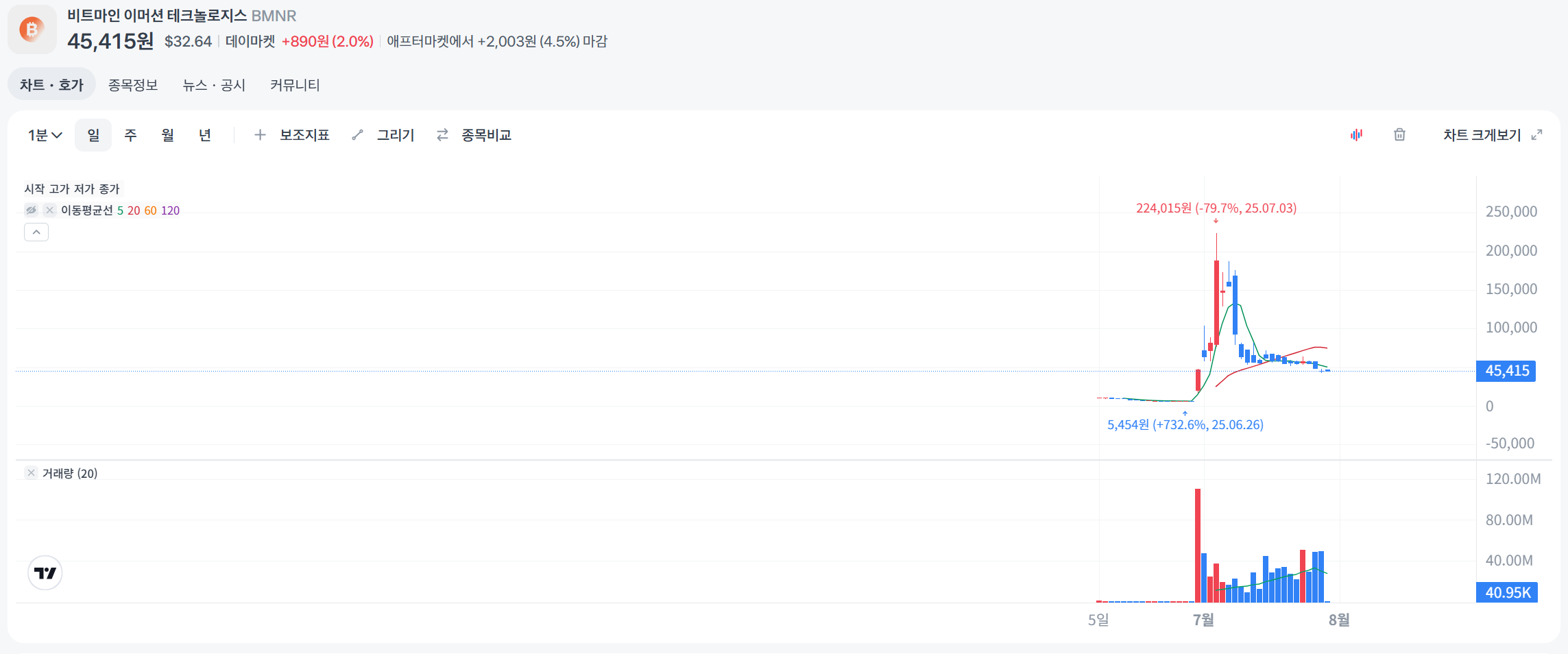 2025년 7월 25일 기준, BMNR 주가는 $40.12로, 시가총액은 약 $2.2B입니다. 2025년 6월 PIPE 거래를 통해 약 4,510만 주와 워런트를 발행하며 자금을 조달했고, 7월 29일 최대 7,590만 주의 재판매 등록을 신고했습니다. 2025년 1분기 매출은 약 $12M, 순손실은 $3.5M으로, 전년 대비 매출은 증가했으나 수익성은 여전히 도전 과제입니다. 회사는 최대 $10억 자사주 매입 계획을 발표했으며, 2025년 7월 기준 625,000 ETH와 192 BTC를 보유하고 있습니다. StockTitan
