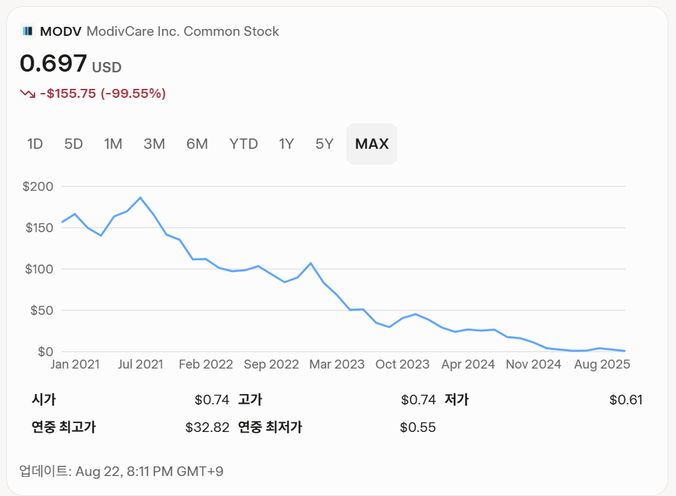 안녕하세요, 투자자 여러분! 오늘은 비응급 의료 운송(NEMT), 개인 간호 서비스(PCS), 원격 환자 모니터링(RPM)을 제공하는 기술 기반 헬스케어 서비스 기업 모디브케어 (ModivCare Inc., NASDAQ: MODV) 주식에 대해 분석하겠습니다. 모디브케어는 최근 챕터 11 파산 신청과 대규모 부채 구조 조정으로 주목받고 있으며, 이 보고서는 2025년 8월 22일 기준 최신 데이터를 바탕으로 주가, 최근 동향, 성장성, 투자 전망을 다룹니다. 투자 전 DYOR하세요!