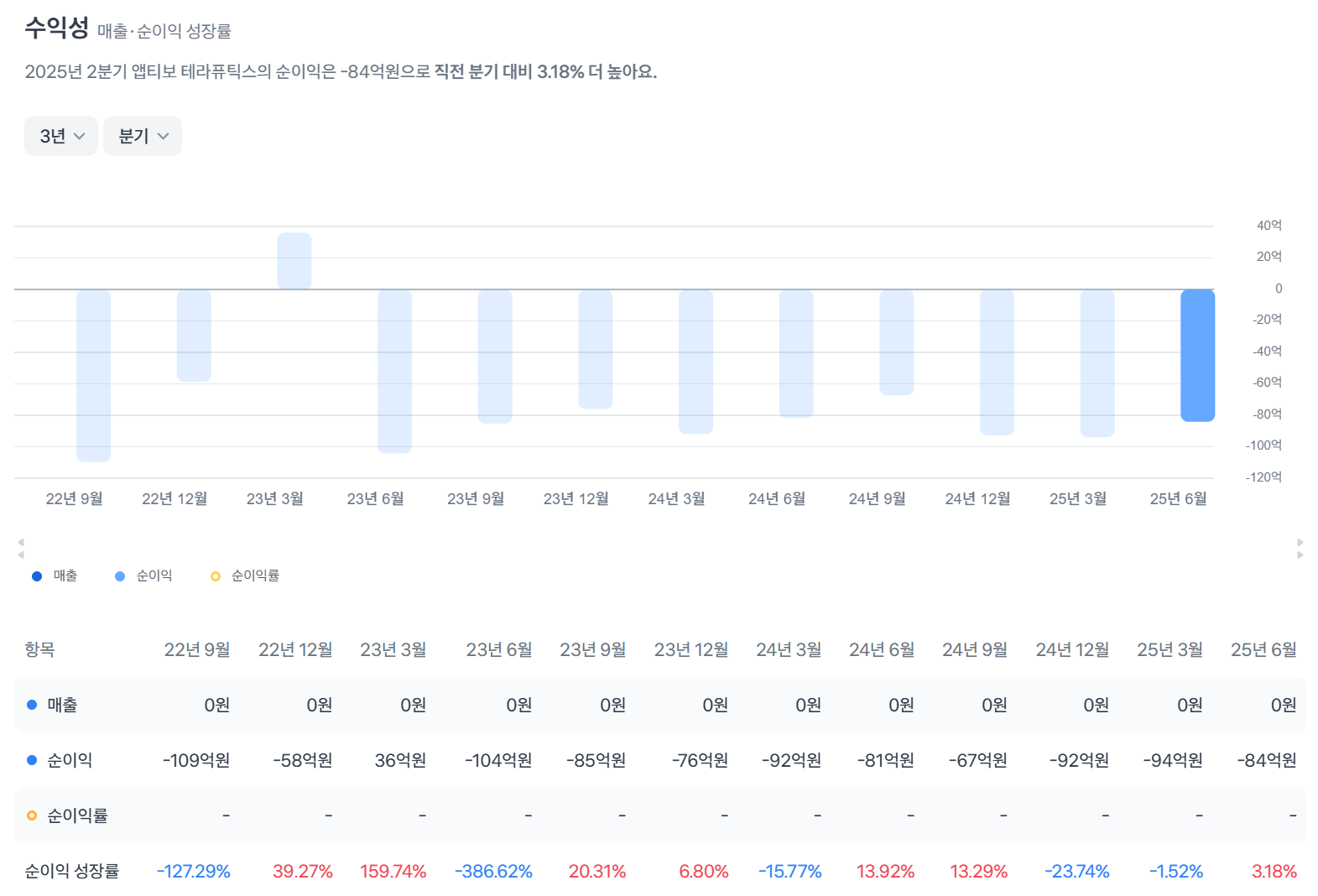 - 매출: 부재(임상 단계 기업)