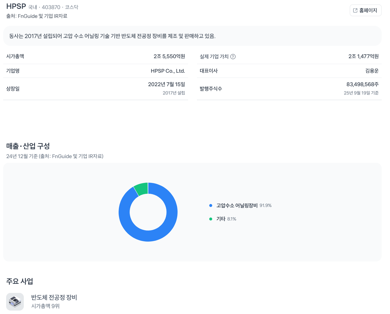 HPSP(High Pressure Processing System)는 2017년 한국에서 설립된 회사로, 고압 수소 어닐링(HPA) 장비를 전문으로 개발합니다. 이 기술은 반도체 제조 과정에서 결함을 제거하고 성능을 향상시키는 데 필수적입니다. 주요 고객으로는 삼성전자와 SK하이닉스가 있으며, 2023년 KOSDAQ 상장(코드 403870) 이후 매출이 급성장했습니다. 2024년 말 기준으로, 연간 매출 1,000억 원을 돌파하며 반도체 공급망의 핵심 플레이어로 자리 잡았습니다.