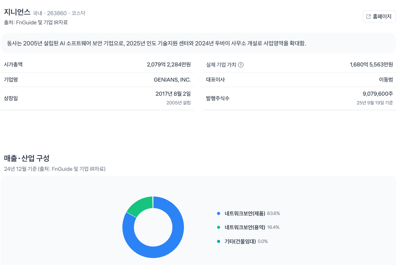 지니언스(Genians Inc.)는 2005년 한국에서 설립된 사이버 보안 전문 기업으로, NAC(Network Access Control) 솔루션을 중심으로 네트워크 접근 제어와 엔드포인트 보안을 제공합니다. 주요 제품으로는 Genian NAC와 EDR(Endpoint Detection and Response)이 있으며, 기업과 정부 기관의 디지털 자산을 보호합니다. 2016년 KOSDAQ 상장(코드 263860) 이후, 회사는 글로벌 확장을 통해 매출을 확대했습니다. 2024년 말 기준으로, 연간 매출 500억 원을 초과하며 사이버 공격 증가 추세에 힘입어 안정적인 성장을 보였습니다.